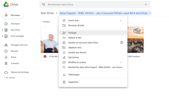 - Pour finir, cliquez sur "partager" et entrez l’adresse email suivante : jeu-concours@rentanddrop.com.