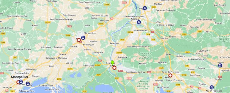 De plus, si vous arrivez (ou repartez) en train, la gare de Sorgues Châteauneuf-du-Pape ne se trouve qu'à 2km. Pour vour rendre à notre agence, vous pouvez utiliser les transports en commun avec la ligne du bus 3 (arrêt Giratoire d'Entraigues).